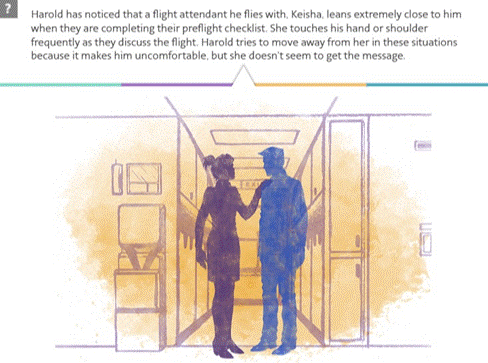 Afterward, I sought out common sexual harassment scenarios by way of stories in news outlets and training guidelines provided by the U.S. Equal Employment Opportunity Commission. Part of this effort involved pulling relevant news stories that occurred in aircraft and at the airport to tie them into our work group specific scenarios.