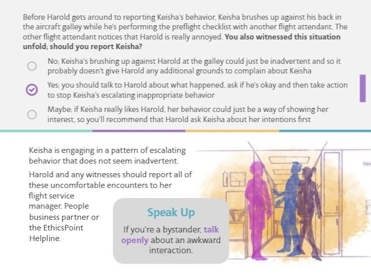 Since preventing sexual harassment is a sensitive topic, it was important that learners could relate to the characters through their job role and work environment. So, I highlighted a variety of individuals in different real-world scenarios relevant to the airline industry.